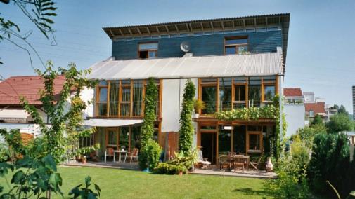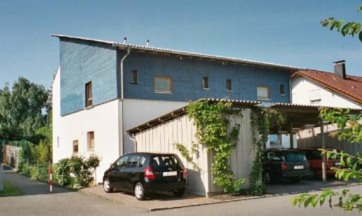 Zur Ausführung kommen sollten ein 30cm starkes Gasbetonmauerwerk, eine Vollunterkellerung in Stahlbeton und ein Dachgeschoss in Holzständerbauweise mit Pultdach und Flachdachterrasse. Die Fassade ist verputzt und in den mit Holz verkleideten Bereichen zusätzlich gedämmt, so dass das Gebäude als Niedrigenergiehaus eingestuft werden konnte. Einen Blickfang bildet die Stahlkonstruktion über der Gartenterrasse. Hier ist eine spätere Nachrüstung mit Solarkollektoren geplant. Des weiteren schützt das Plexiglasdach die Holzfenster vor Schlagregen und bietet eine diffuse Verschattung im Sommer.