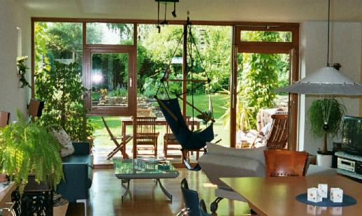 Die Lage des Grundstückes ermöglicht es das Gebäude exakt in Nord-Süd-Richtung zu positionieren. So entstand der häufig verwendete und energetisch durchaus sinnvolle Gegensatz zwischen geschlossener Nord- und offener Südfassade. Durch die wenigen kleinen Fensteröffnungen der im Norden angeordneten Nebenräume wirkt das Haus eher introvertiert. Die unterschiedlichen Fensterformate und ihre Anordnung erzielen aber eine abwechslungsreiche Komposition. Zur Gartenseite geht es großzügig aus den Wohnräumen in den Garten über. Der Kochbereich wird gänzlich mit in das Wohn- und Alltagsgeschehen einbezogen. Das Obergeschoss (bzw. das UG) bietet Rückzugsmöglichkeiten. Hier befinden sich Schlaf- und Arbeitszimmer.